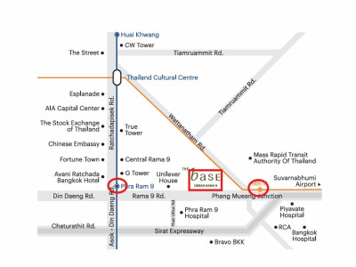 Sansiri The Base Urban Rama9 擁有無與倫比的地理位置,距離 藍線MRT拉瑪九站僅900米,橘線MRT 250公尺, 完美連接多條穿 梭曼谷的交通網絡。